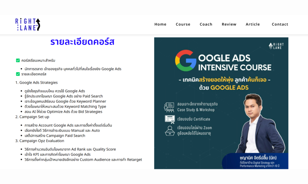 Right Lane Marketing เปิดคอร์สสอน Google Ads แบบเข้มข้น เน้นสอนเทคนิคสร้างยอดขายและลงมือปฏิบัติจริง โดยวิทยากรผู้เชี่ยวชาญ เหมาะสำหรับผู้ที่ต้องการเรียนรู้แบบจัดเต็ม และนำไปใช้ในการทำธุรกิจได้จริง