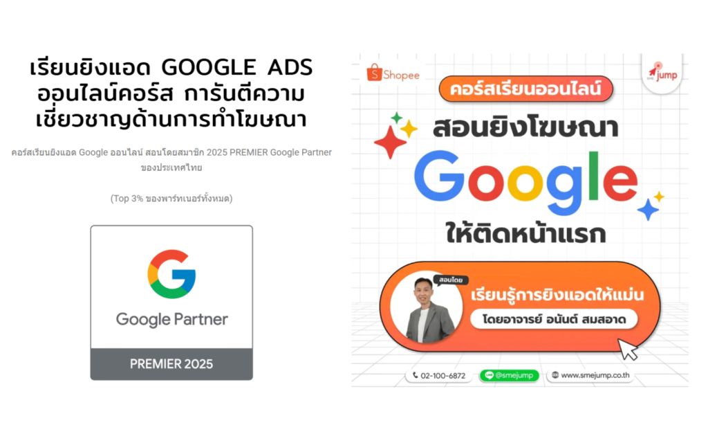 SME Jump ได้เปิดคอร์ส Google Ads ที่ครอบคลุมการทำโฆษณาหลากหลายรูปแบบ เน้นการสอนแบบจับมือทำ มี Workshop ให้ลงมือปฏิบัติจริง อัปเดตเทรนด์การตลาดออนไลน์อยู่เสมอ มุ่งเน้นการสอนให้ผู้เรียนนำไปใช้ได้จริง เหมาะสำหรับผู้ที่ต้องการเรียนรู้การทำ โฆษณา Google และผู้ที่ต้องการนำความรู้ไปใช้ในการทำธุรกิจ